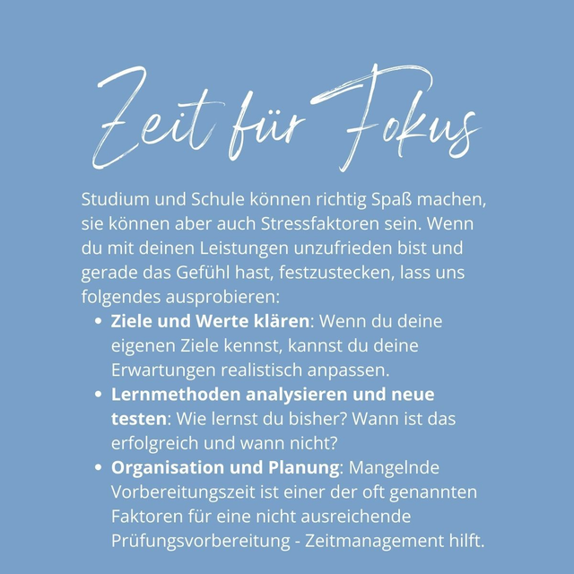 Lass uns gemeinsam deine Stärken und Wünsche herausfinden, deine Motivation und Willensstärke wecken und so dein Lernen nachhaltig verbessern. Ich begleite dich ein Stück auf deinem Weg in Richtung Zukunft und helfe dir dabei, in der Schule oder dem Studium (wieder) richtig durchzustarten! Wir schauen gemeinsam, wie du Nerven sparst und deine Energie gezielt einsetzt, wie sich dein Lernen verbessern lässt und wie du mit der Zeit, statt gegen sie arbeiten kannst. Du lernst unterschiedliche Lernmethoden, Motivationstechniken und Organisationsmöglichkeiten kennen.